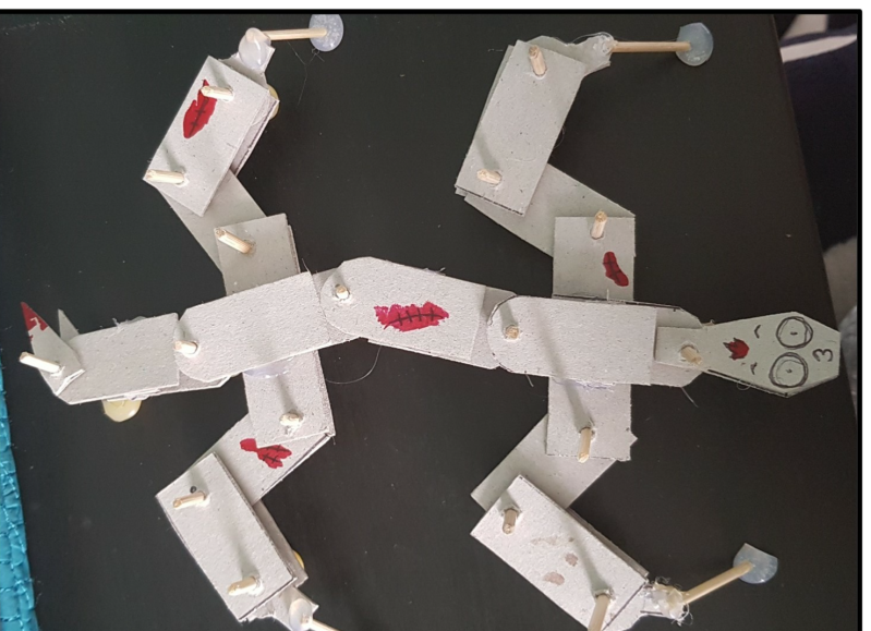 Dit is het spuugmodel van de Gekko. Je kunt goed zien hoe we willen dat de gewrichten in elkaar zitten zodat de gekko flexibel is.